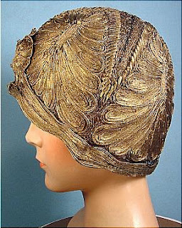 This image is from one of our favourite websites, "antique dress". It is a detail side view of an original 1920s scull cap apparently owned by the famous silent screen star "Theda Bara". The intricate pattern work of the gold threads reminds me of Egyptian patterned tombs and scrolls......... Egyptian pattern seemed to heavily influence the 1920's ............ possibly connected to the discovery of Tutankhamen's tomb in 1922?